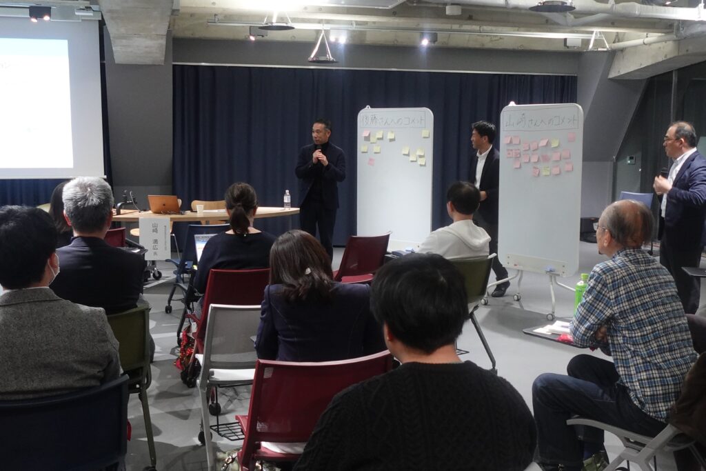 振り返りセッションでは、山崎 氏・後藤 氏からの話題提供を受けて、参加者同士は自身が感じたことなどについて意見交換を行いました。司会の川邉雄司 准教授や会場の参加者から寄せられたコメントや質問を受けて、山崎 氏からは、産業デザインや資本循環デザインを設計する上では、専門家のみならず、ローカルな人材もメンバーに含めた官民連携による支援チームによる実践が重要であるとの話がありました。後藤 氏からは、まちづくりの活動の在り方は場所によってさまざまであり、まちづくりにかかわる主体が模索し続けて、その模索した知恵を人びとが交換するような社会としていくことを支援していきたいのコメントがありました。